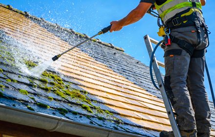 Démoussage de toiture, application d'hydrofuge et peinture sur tuiles béton pour redonner de l'éclat et protéger durablement vos matériaux.